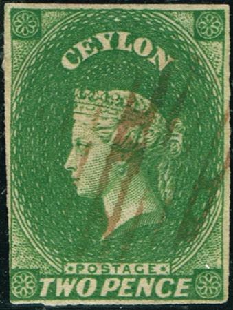 Ceylon (Sri Lanka). 1857 2d imperf. yellowish-green. Four margins. Tiny thin spot on back. Fine used (red cancel). SG 3a. |