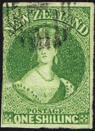 | FFQ Chalon. 1/- imperf. Used (face part clear). 3½ margins. Has a piece of paper embedded in the stamp before printing (near QV's right shoulder. SG 45.
