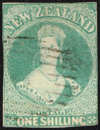 | FFQ Chalon. 1/- blue-green Richardson on white paper. Fine used ('16' in bars). Four close margins. Slight thin. SG 16.