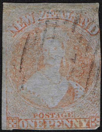 | FFQ. 1d red (Richardson deep blue paper). Very fine used (face clear). Two margins. So heavily blued that the design is overpowered. SG 4. Catalogue value $7,000 +GST.