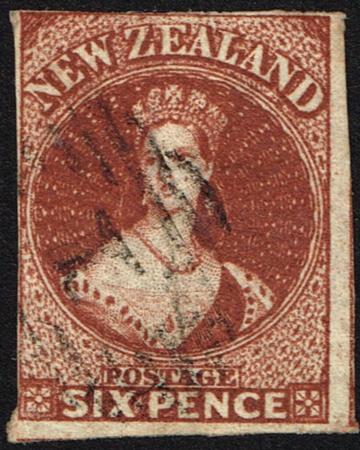 | FFQ Chalon. 6d red-brown. 'NZ' wmk. Fine used. Four margins (two are close). SG 99. Catalogue value $2,500 +GST.