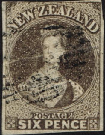 | FFQ Chalon. 6d black-brown Davies print. Fine used - '7' in bars (face nearly clear). Four margins (touching at top left). Horizontal crease. SG 41. |