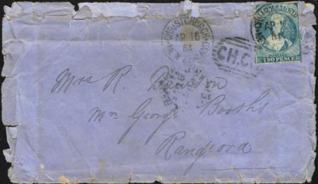| FFQ Chalon. 2d blue Davies print (four margins and crease) tied on cover. Posted Christchurch AP 16 1864. Cover is very tatty.