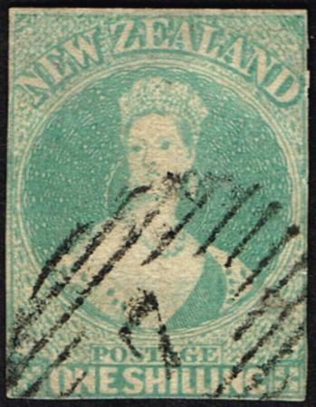 | FFQ Chalon. 1/- imperf in blue-green (no wmk, white paper). Four margins (two are very close). Very fine used. Hinge thin. Has evidence of roulettes at top right. (SG 31 with roulettes - CV $12,500). SG 17 (CV $4,000).