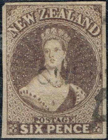 | FFQ Chalon. 6d brown. Very fine used (part Maori Wars 'Onehunga/A' cancel). Four excellent margins. CP A5b, SG 42.