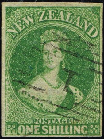 | FFQ Chalon. 1/- imperf (star wmk.) in deep green. Four margins. Fine used (Auckland 1 cancel). Face mostly clear. Excellent condition. SG 46. Catalogue value $1,750.