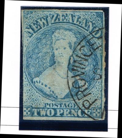 | FFQ Chalon. 2d blue 'NZ' wmk. Used (fine part 'Province of New Zealand' cancel. Writing on back (see scan). Light tone. Four margins (touching lower left). Roulette 7 on RHS. CP A2j(Z), SG 102. Catalogue value $2,250.