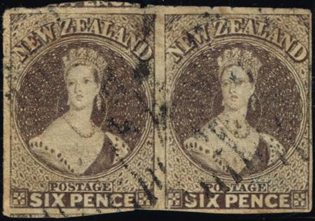 | FFQ Chalon. Imperf 6d Pelure pair. Fine used. Four margins. Scarce in multiples. Back tones. Top roulettes?? (no guarantee). SG 85. Catalogue value $1,500.