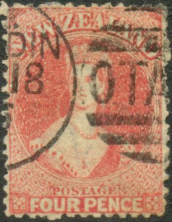 | FFQ Chalon. 4d Rose. Fine used (Dunedin, Otago duplex). Well centred. SG 119. |