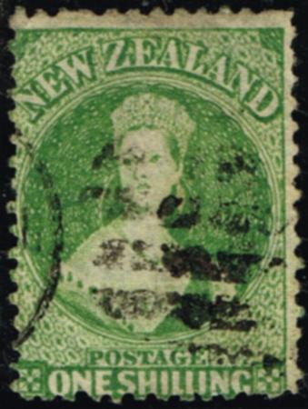 | FFQ Chalon. 1/- deep yellow-green. Perf 12½ (star wmk.). Used (face part covered). Lower left centred. SG 125.