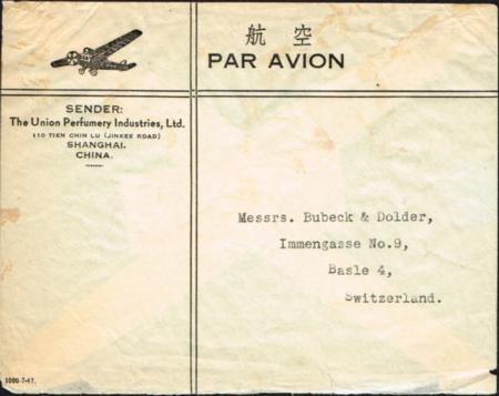 | China (People's Republic). Printed ('The Union Perfumery Industries Ltd, Shanghai') airmail cover to Switzerland (1947). Franked on back with three $10,000 stamps (SG 965).