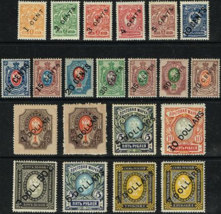 | China. Russian Post Offices. 1917 Arms type. LHM set of 19 (plus the two extra $1 and $7 with the 43º overprint slope). SG 39/57. |