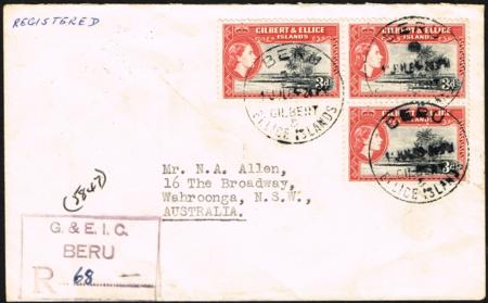 | Gilbert & Ellice Islands. Three 3d QEII on registered cover posted Beru Island (11 July 1965) to Australia.