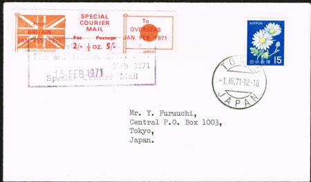 | Great Britain 1971 postal strike cover to Japan. With 'Special Courier Mail' label tied (15 Feb 1971). |