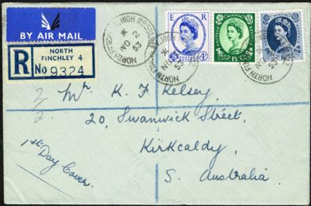 | Great Britain. Registered QEII FDC franked with 4d, 1/3d and 1/6d (SG 521, 530 and 531). Posted Nov 2 1954. Scarce. Catalogue value £170.