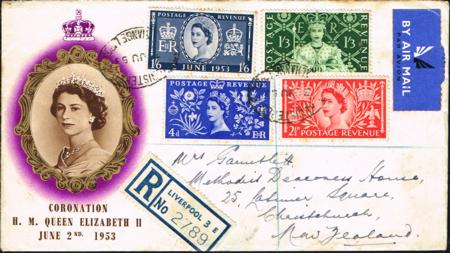 | Great Britain. 1953 QEII Coronation set of four on registered illustrated FDC to New Zealand. |