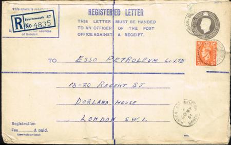 | Great Britain Postal Stationery. Registered cover. 8½d KGVI (size H). Used (20 May 1954). Huggins RP71.