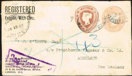 | Great Britain Postal Stationery. Registered 'stamp to order' cover. 1d + 1½d QV dies. Fine used front, back missing (Jan 15 1902) to New Zealand. Huggins ESC25 . |
