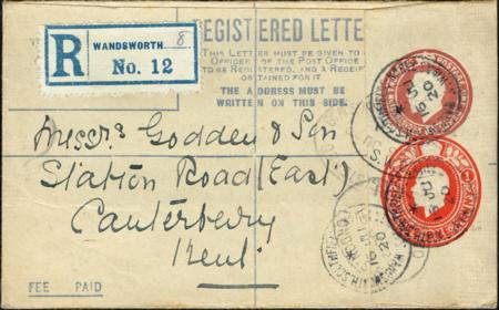 | Great Britain Postal Stationery. Registered cover. 3d + 1d dies KGV (size F). Used (16 June 1920). Huggins RP32.