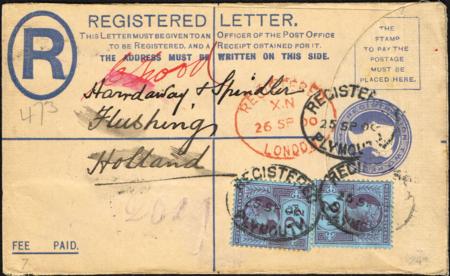 | Great Britain Postal Stationery. Registered cover. 2d QV (size F). Used (25 Sept 1900) to Holland. Two additional 2½d stamps tied. Huggins RP22. |