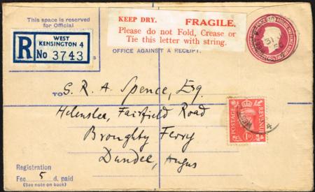 | Great Britain Postal Stationery. Registered cover. 6½ KGVI (size G). Used (31 July 1950). Additional 1d stamps tied. "Fragile. Keep Dry" label attached. Huggins RP68.