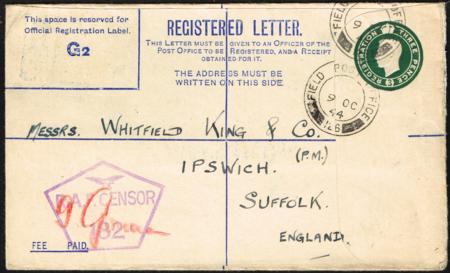 | Great Britain Postal Stationery. Forces Issue Registered cover. 3d KGVI. Used (9 Oct 1944). Censored. Huggins RPF2 but with different 'G2' format layout (See Huggins' amendemnts, page 10 "Very few examples recorded"). |