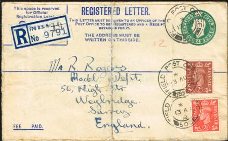 | Great Britain Postal Stationery. Forces Issue Registered cover. 4d KGVI. Used (13 Aug 1952). Folded down centre. Additional 2d and 2½d tied. Huggins RPF3.