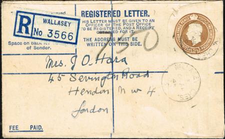 | Great Britain Postal Stationery. Registered cover. 5½d KGVI (size F). Used (1945). Huggins RP54, H&G 67.