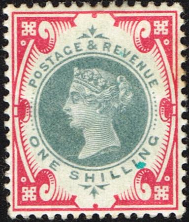 | Great Britain. 1887 1/- green and Carmine. LHM. Gum tone spot. Green mark under L in 'Shilling'. Reasonably centred. SG 214../.