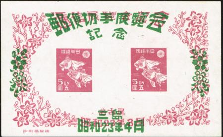 | Japan. 1948 Mishima Philatelic Exhibition. Imperf mini-sheet (three characters at bottom) with the green overprint. Unused (no hinging and no gum as issued). SG MS475.