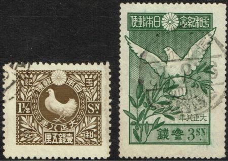 | Japan. 1919 Restoration of Peace. 1½s (perf 12) plus 3s (perf 13½ x 13). Fine used. SG 192a/193. |