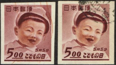 | Japan. 1949 Children's Exhibition mini-sheet. Two used singles (red and black postmarks). SG MS532. |