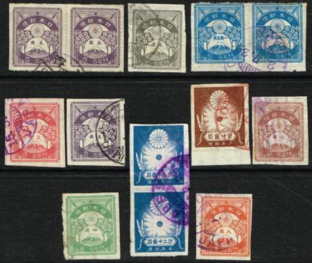 | Japan. 1923 Earthquake Emergency Series. Imperf set of nine (including three pairs). All used. SG 215/223. |