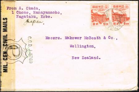 | Japan. Censored cover posted Kobe to New Zealand. |