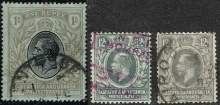| Kenya, Uganda and Tanganyika. 1919 1R black/green on emerald back. Used. SG 53a. plus SG 2 x 48 used.