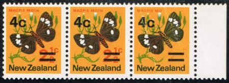 | 4¢ Photograuvre overprint. UHM strip of three with red part omitted on one stamp. CP P30a, CP 957. |