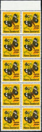 | 4¢ Photograuvre overprint. Mint block of ten showing the broken perf pin between stamps in rows 1, 3 and 5. |