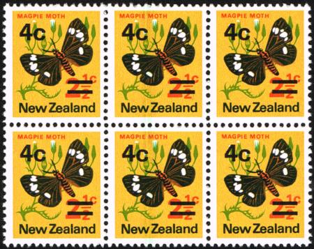 | 4¢ London Letterpress overprint. UHM block of six with green vertical doctor blade flaw. |