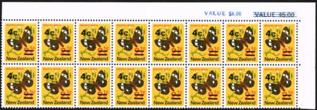 | 4¢ Local Letterpress. UHM value block of 16 with the sheet value corrected in blue (scarce in blue). CP P30c. |