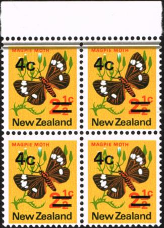 | 4¢ Photograuvre overprint. UHM (hinge in selvedge) block of four with two very strong doctor blade flaws. Being horizontal means they are from the overprinting process. From plate 2A.