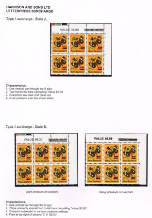 | 4¢ London Letterpress overprint. Four pages from a medal winning collection with eight different sheet value blocks of six showing the various surcharge states with descriptions of differences. |