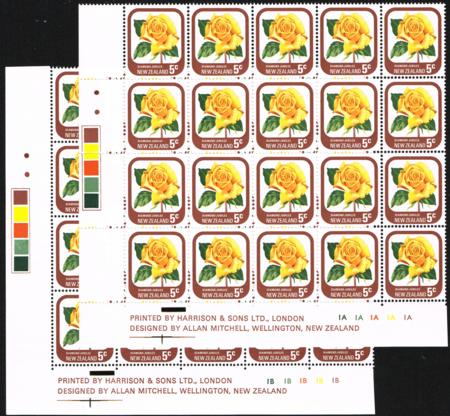 | 1975 Roses. 5¢. UHM plate blocks (1A and 1B) of 20 with two dots in the selvedge. CP PA5a.