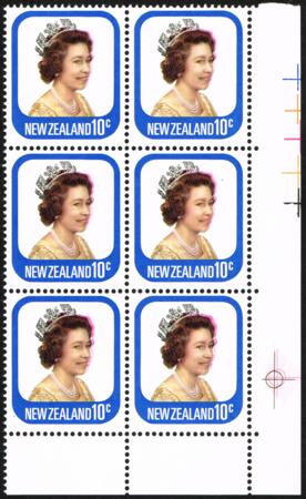 | 1975 10¢ QEII. UHM block of six with a small misplacement of the magenta colour.