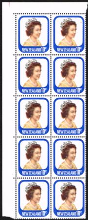 | 1975 10¢ QEII. Perf 14¼ x 14½. UHM block of ten with a small skewing of the red colour. |