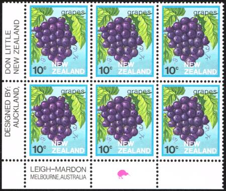 | 1983 10¢ Fruit (Grapes). UHM imprint block of six with one Kiwi. CP PB7a, SG 1283.
