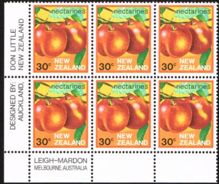 | 1983 30¢ Fruit (Nectarines). UHM original imprint block of six. Perfs through bottom selvedge. CP PB9a, SG 1285.