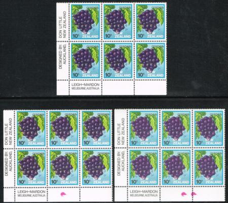 | 1983 10¢ Fruit (Grapes). Set of the three imprint blocks of six (original; one Kiwi and two Kiwis). CP PB7a/b, SG 1283. |