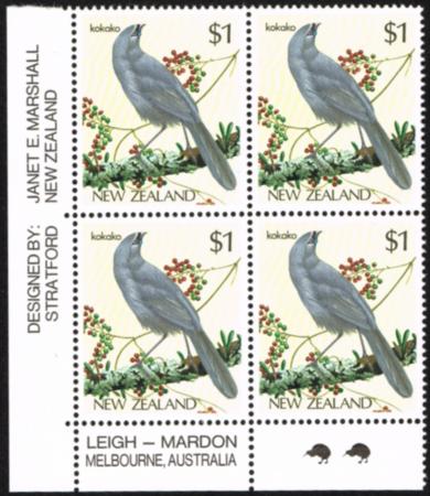 | 1985 $1 Birds (Kokako). UHM imprint block of four with two Kiwis. CP PC5b, SG 1292.