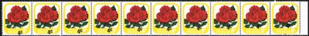 | 1979 4¢ Rose Provisional. UHM strip of ten with double overprint (one very twisted resulting in the '4c' being hidden by a leaf in the design). CP PA30a(Z).