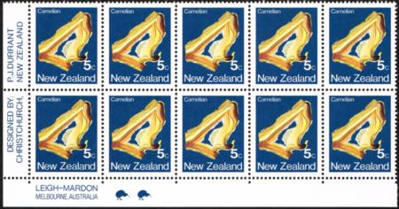 | 1982 Minerals. 5¢ (white paper). UHM plate block of ten with two Kiwis. No perfs through bottom selvedge. CP PB5a.